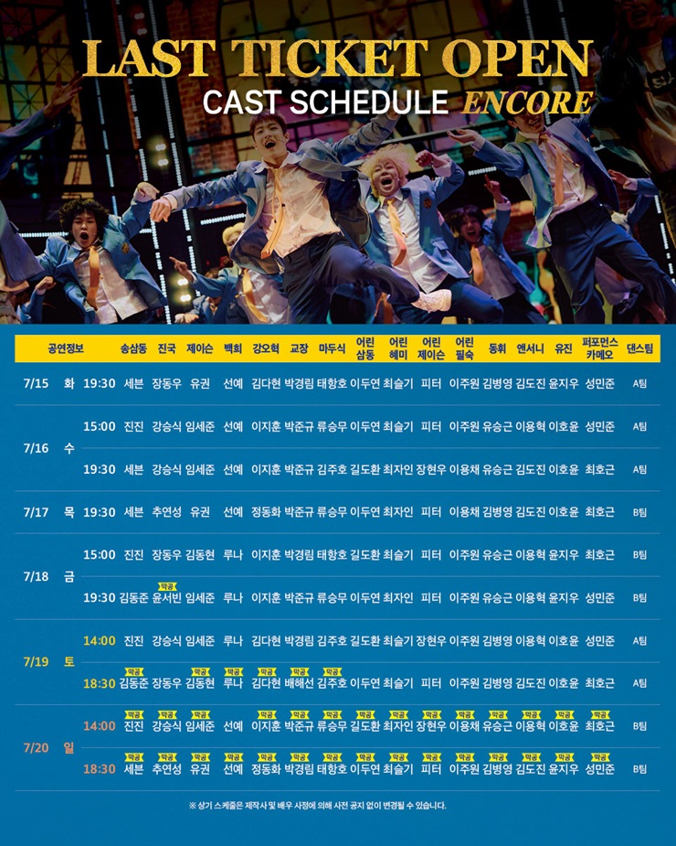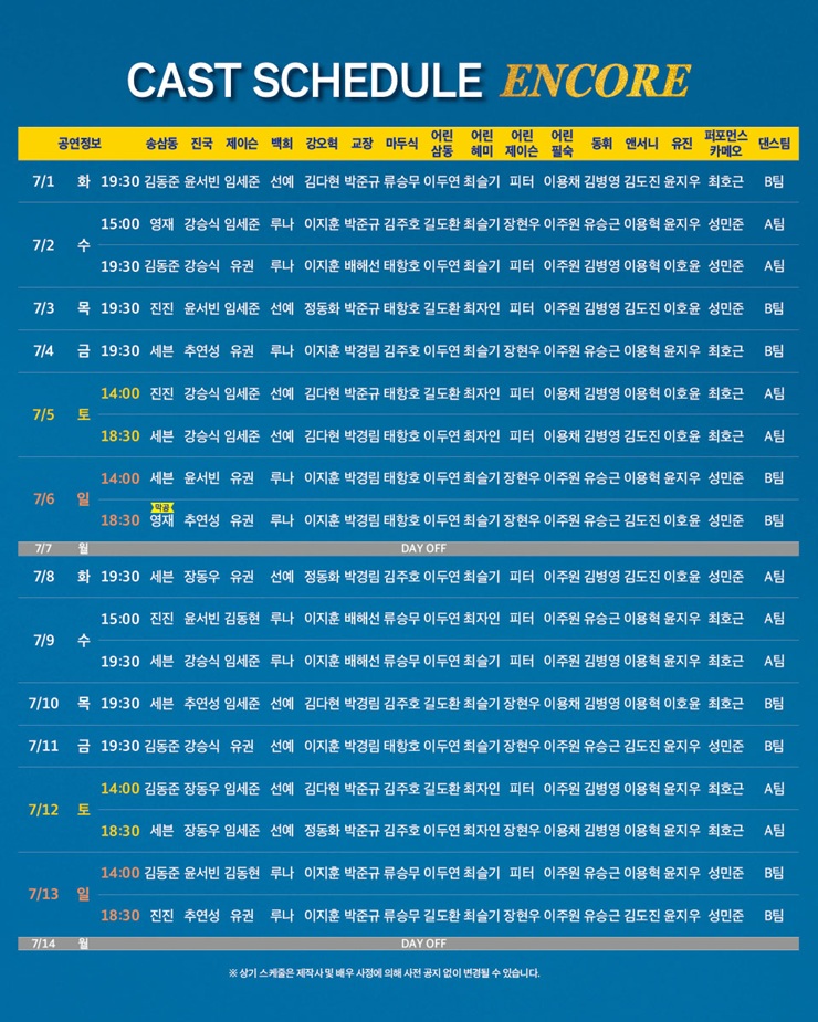 화, 목, 금 19시 30분 / 수 15시, 19시 30분 / 주말 및 공휴일 14시, 18시 30분 / 월 공연 없음